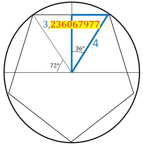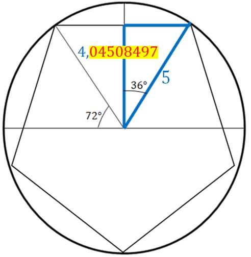 Cuando el -R- radio vector resultante (radio del círculo en el que se supone inscrito el pentágono) tiene el valor de 4 è 4ªFracción-Dimensión. La ''altura'', o sea la distancia del centro de la circunferencia a la cuerda. O lo que es lo mismo. La diferencia entre EL RADIO y la flecha o sagita, o sea la distancia de cuerda a circunferencia. Es: