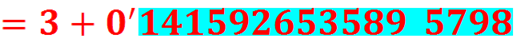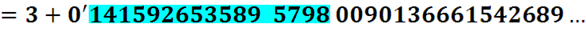 Como ven las 12 primeras cifras decimales son idénticas al concepto clásico, que todos conocen y dan por bueno. El real y que utilizamos en el cálcolo de los procesos ondulatorios reales es el que ofrecemos aquí conesta metodología y conceptuación de cálculo. Realmente a partir de la 16ª cifra decimal ya podría darse por EXACTA LA CIFRA dado que a continuación vienen DOS CEROS. Tengan en cuenta que con solo 10-12 cifras podemos dar dos vueltas enteras a TODO EL MIC (Universo) SIN DESVIACIONES OBJETIVABLES. ***************************************************´ Veamos ahora la conceptuación de la 2ª parte que debemos DESCONTAR de esta cifra. Para obtener el nº Real. Y el porqué de estos aspectos.