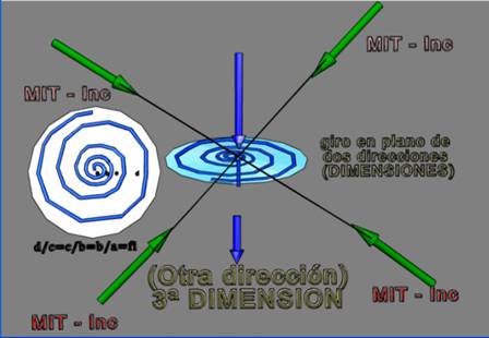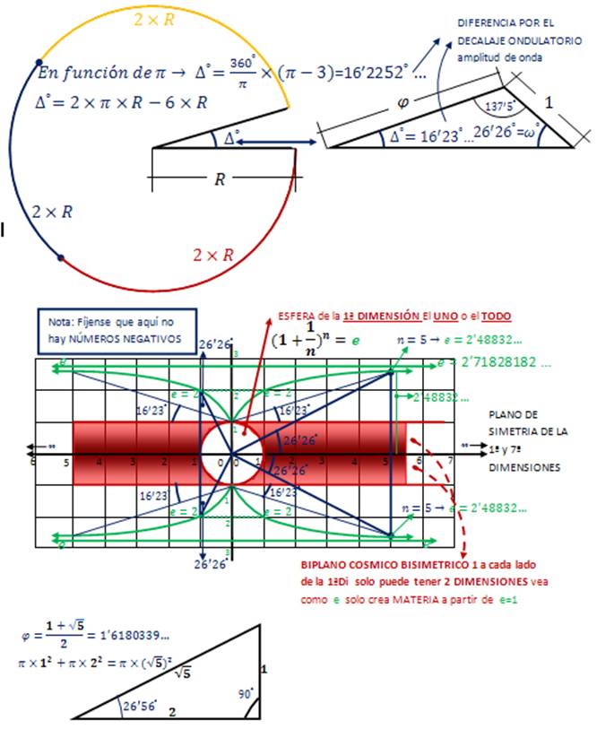 es de 26'260-16'230 Fíjense: Son 100 a cada lado del eje de rotación. Luego el ''bamboleo al girar'' es un total de 200. Y 3600/20 = 18. O sea -9- dimensiones o ascensos a cada lado del eje, y también del plano de bi simetría. è 7 dimensiones del COU (+) las 2 del plano generatriz'. **************************************** Quiero remarcar, que aquí no hablamos de un mecanismo de ''compactación'' al estilo de KALUZA y de KLEIN. O de Einstein que se inspiró y apoyó en ellos para desarrollar su visión relativista. Ni de la ecuación de Lorentz, etc. Ni de los muy loables esfuerzos de todos ellos y de muchos otros para intentar cuadrar compactación con ¿cuarta dimensión à ''tiempo'' (otro invento) . E intentar conciliar todo ello con la TEORÍA DE CUERDAS'. Por cierto la teoría más ''cuerda'' de todas'. TODAS Y CADA UNA DE ESTAS PERSPECTIVAS DE ENFOCAR EL PROBLEMA. TIENEN PARTES DE ACIERTO, PERO TAMBIÉN MUCHAS IDEAS DE CONCEPCIÓN BASICA ERRONEAS. En especial EN SUS CONCEPTUACIONES INICIALES . Y no tanto en los desarrollos matemáticos , que en general suelen ser siempre correctos à Si no fuera por algunos pequeños aspectos, que aun cuando parezcan menores conducen sin embargo en ocasiones a auténticos totales desaciertos, por falta de un mínimo paralelismo con la realidad . Un ejemplo claro son en ocasiones ( ni mucho menos siempre) los nºs negativos , y en especial el nº- i . Este ''neo-concepto'', el nº -i-, al que gustosamente yo denominaría: ''maravilla esotérica''è por su falta del más mínimo sentido REAL. Si verdaderamente se pretende COMPRENDER LA REALIDAD. Si bien es verdad que en multitud de ocasiones se auto anula, sin provocar desacoplamientos con la realidad. Sin embargo en otras implica la aceptación de posibilidades NO - REALES. Y consecuentemente provoca un grave des-paralelismo entre las posibilidades del desarrollo ecuacional y la realidad.