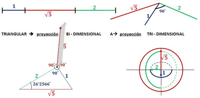 ÁNGULO è Esta imposibilidad de cerrar el círculo en un nº exacto de veces el Radio, o el Diámetro. Resulta que es una de las 4 o 5 cosas que veremos que hacen posible el ascenso inter dimensional. Por ello existimos todos y todo. Como iremos viendo en los desarrollos. Y ya en la 7ª Dim SI cierra, y termina el ascenso. 2-ARRIBA A LA DERECHA.- è TRIÁNGULO - Si tomamos dos segmentos , que estén en la