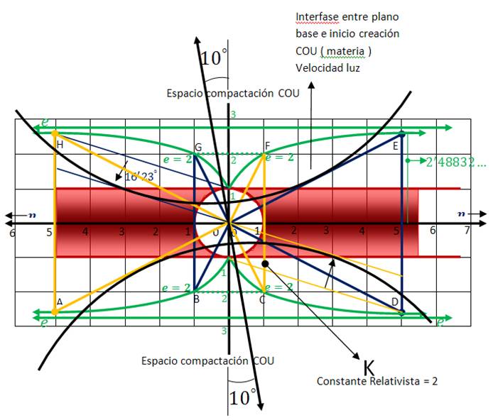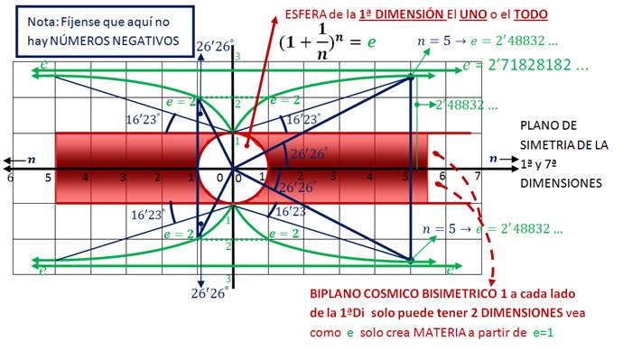 Esquematiza el inicio de los procesos de creación de: El Volumen - Movimiento Ondulatorio y el de los C.O.U.s à ''materia''. Procesos inmediatamente posteriores al de la creación del 1 à o EL- TODO. El 1- o- el TODO se observa aquí , como círculo central de radio -1-. Ya formado anteriormente en función de exponenciales de e. Cuando n = 0 è implica e = 1 La explicación no procede ahora en esta primera presentación abreviada, aquí solo lo citamos. Pero si diremos ya que siempre, la letra - n - la reservamos para referirnos al nº de dimensión. Por lo que debemos entender que en este caso, n deberá representar simultáneamente, tanto el nº de la Dimensión = 0 en este caso, ya que en el inicio, no había NADA. Como el exponente de la fórmula de e. Aquí vemos la proyección en un plano. Pero ello debe entenderse por partida triple. En cada uno de los tres planos euclidianos . Y como sólido de rotación , en cada uno de los tres planos euclidianos. Configurando y contextualizando pues un volumen. Este proceso se genera de forma constante e ininterrumpida desde el inicio de la ''creación'' à Proceso matemático. Y como veremos è de forma matemáticamente Imperativa e inexcusable. Se produce constantemente, en todos y cada uno de los infinitos puntos matemáticamente conceptuales del Universo. No se trata pues de la ''EXPLOSIÓN INICIAL'' de UN SOLO PUNTO (''Big-Bang'') que se EXPANDE. Y cuya ''EXPLOSIÓN y posterior EXPANSIÓN'' [ ( ¡¡¿¿--??!!)] ¿Genera? TODO EL UNIVERSO. '. Nada de fuegos artificiales'. Primero, cada uno de los infinitos puntos conceptuales posibles , generan la UNIDAD, primero plana , y luego volumétrica , a partir de n=0 à e=1 . Generando pues el plano base de GROSOR la UNIDAD y por tanto, realmente ya volumétrico , pues tiene grosor 1 à la Unidad . En forma bisimétrica a cada lado del PLANO DE SIMETRÍA DE LA 1ª Dim. Como veremos en los desarrollos. Genera primero como vemos, la unidad en función de e. Y esta base, o CÍRCULO