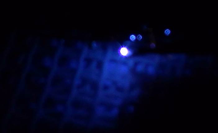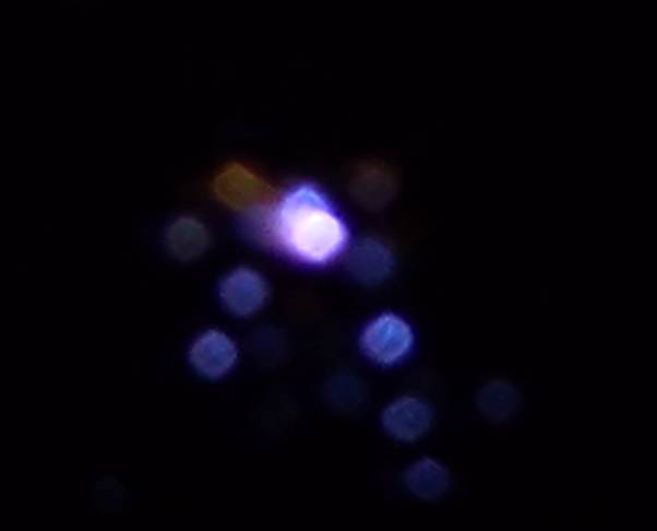 3-/ Bonita instantánea en la que se aprecian un grupo de unidades saliendo de la rejilla de emisión. La imagen redondeada e intensamente iluminada inferior, no corresponde a un elemento en fase fotónica terminal, si no al foco inicial BISIMÉTRICO de emisión, que correspondería a la últimamente tan cacareada ''Mariposa de Hofstadter''. Pero ya extinguiéndose, ya que aquí los elementos salientes ya están en fase AZUL, y por tanto la ''mariposa'' ya es antigua. Pero aparte de esto. Los elementos se aprecian con una nitidez exquisita. Observen el reborde ondulatorio, el eje magnético central y la depresión ondulatoria intermedia. Así como su PERFECTA DEFINICIÓN EXAGONAL. Da la sensación de que se salen de la foto y pudiéramos pinzarlas con los dedos'