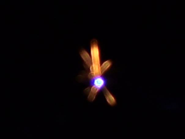 Las siguientes imágenes han sido proporcionadas por el Biplano-Base, coincidiendo con CADA UNO DE LOS CAMBIOS DE POLARIDAD EN 50 HERTZIOS DE LA CORRIENTE ALTERNA (pero en este caso proveniente de un INI; no de la RED) QUE ESTÁBAMOS HUTILIZANDO de 220 / Voltios. Cada ''explosión'' corresponde a un TOTAL ENERGÉTICO de 0'005 mA è Mili-Amperios. Como son 50 Hertzios, o sea à 50 Emisiones/Segundo, y cada hora son 3600 Segundos. El total de potencia emitida por hora sería. 0'005 x 220 x 50 x 3600 = 198.000 Watios / Hora è 198 Kw/H Que no está nada mal ', para la pequeña Unidad Familiar real de la que se han obtenido la imágenes.
