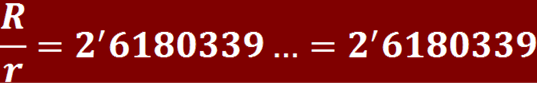 Y observen las propiedades y relaciones de esta fracción.- 1 - 0,6180339 = 0'3819661 è 0'3819661+ 0'236067977 = 0'6180339 O sea que 0'236067977 es el FACTOR DE EXPANSIÓN: (Recuerden todo aquello que hemos repetidamente expuesto sobre el fraccionamiento de la UNIDAD en dos partes, que obligatoriamente CONFIGURAN UNA TERCERA, que es la diferencia entre estas dos partes. Que aquí, esta TERCERA PARTE DIFERENCIA DE LAS OTRAS DOS SERÍA à 0'236067977')