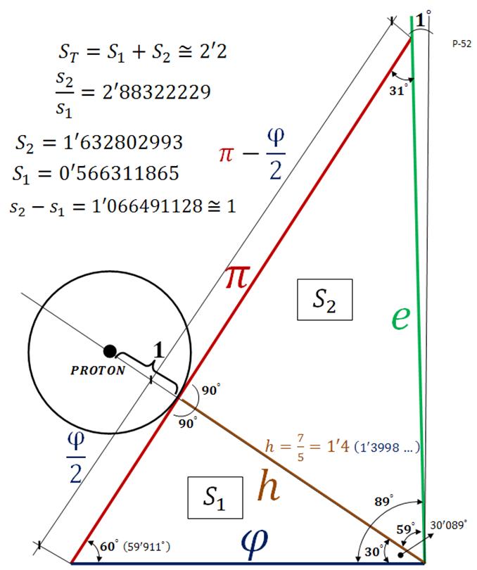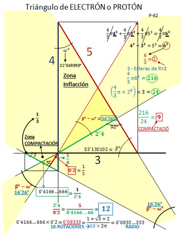 que hemos explicado sobre el anterior triángulo Y decimos solo casi, porque existe el decalaje del ángulo oscilatorio del eje de è 10. 4-/ En el esquema de este triángulo 3-4-5 indicamos a la derecha en verde, que la relación SOLO VOLUMÈTRICA entre la esfera FOTÓNICA resultante de radio-6 y la SUMA de