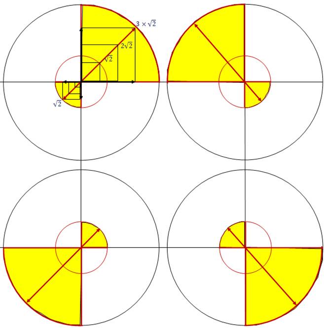 A CÓNTINUACIÓN REPETIMOS ESTOS -4- ESQUEMAS. PERO DÁNDOLES YA SUS formas ESFÉRICO circulares REALES è Primero circulares. Que luego serían la base volumétrica. Si los imaginamos como sólidos de rotación en tres-dimensiones-Euclidianas.