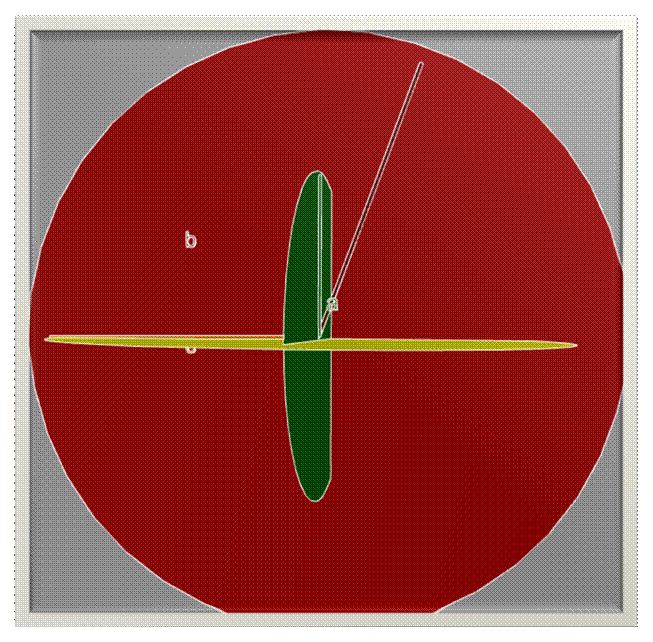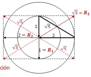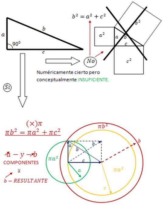Esquema de la interacción en 2 - dimensiones . La magnitud, de cada radio diferirá lógicamente en cada caso , en función de cada dimensión. Interprétese que dos planos rotacionales-ondulatorios (primero planos, luego esferas en -3- dimensiones Euclidianas) interaccionan un ángulo de 900 entre sus respectivos planos-base-planos-generacionales de cada una Los radios primarios son los vectores COMPONENTES y la hipotenusa del triángulo rectángulo es el Vector Resultante Rotacional que genera la resultante à superficie-circunferencia primero. Y DIMENSIÓN TRIDIMENSIONAL final. Si esta circunferencia la conceptuamos como sólido de rotación.