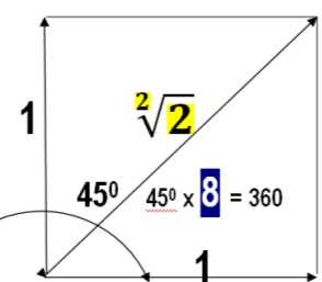 Téngase en cuenta que -8- es la Octava Parte de la Unidad è 8ª Parte de la (ESFERA = Unidad) Y corresponde a 450. Que es la DIAGONAL, o sea el Radio-Vector Resultante, de DOS Radio Vectores generatrices UNIDAD.
